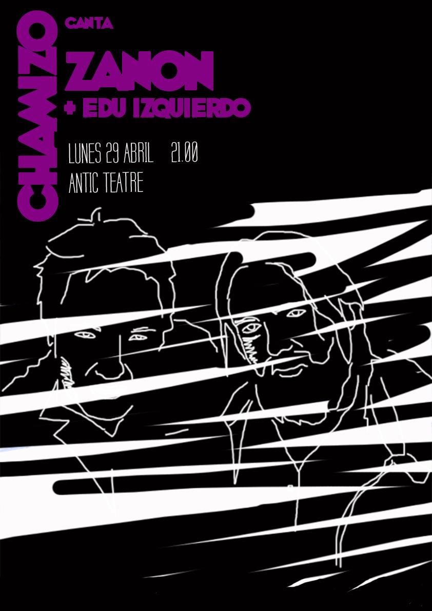 22h (más o menos). La Chamiband en acción. Empezamos con las habituales en nuestro repertorio: Carne Cruda, Insistes, La Machina, Psicogaraje de juguete y Et Moi et moi et moi (cantada por Irene). Continuamos con una versión de Alicia Golpea (grupo en el que coincidimos Zanón y yo en los 90), también cantada por Irene, «El hombre de polvo». Y para terminar las cuatro del CD Chamizo & Zanón. Esperamos repetirlo pronto (estamos buscando sitio donde hacerlo). Os dejamos el video de la última canción del concierto con la letra (poema de Zanón) subtitulada.